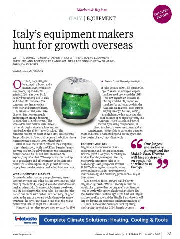 Gianneschi, which makes pumps, blowers, waterpressure systems and other marine systems, saw sales drop by 3% in 2014, largely due to the weak domestic market. Alessandro Gianneschi, business developer, told IBI that despite the lower sales, he considers the Italian market “static” rather than declining. “A good order at the end of the year could change the entire situation,” he says. “But having said that, the Italian market was 80% stronger for us in 2008.”